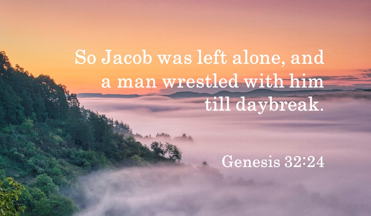 When we stand in fear, we tend to take matters into our own hands instead of standing on what we know about God, instead of standing on the promises we’ve heard directly from Him, or standing on the promises and protection we have already received. Fear causes us to forget who God is. And it is in this mindset of fear that we come to this strange interaction where “Jacob was left alone, and a man wrestled with him till daybreak” (Gen 32:24 NIV).